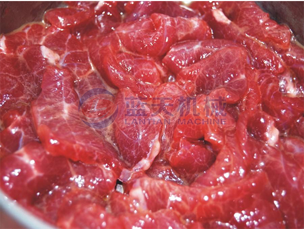 根據(jù)口味需求,加入各種調(diào)料腌制,如鹽、醬油、 白糖、 五香粉、 辣椒粉等等,腌制調(diào)料要攪拌均勻,保證入味,加工廠一般選用牛肉腌漬滾揉機。腌制的溫度保持在0℃~4℃。(根據(jù)口味的不同,可以搭配不同的調(diào)料,以調(diào)成五香、咸干、原味等等)